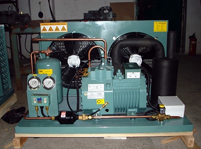 一种用于压延机冷却的冷水机,其特征是:该冷水机表面上设有一进水口、一出水口,以及复数个散热孔;该冷水机内设有一蒸发器,所述进水口和出水口与该蒸发器相连形成一水路循环;与该蒸发器又相连的是一压缩机、一冷凝器和一节流机构,它们之间用管道依次连接,形成一个密闭的系统,工作介质在该系统内循环。压延机冷却的冷水机,其特征是:在冷凝器和节流机构之间还设有一干燥过滤器。